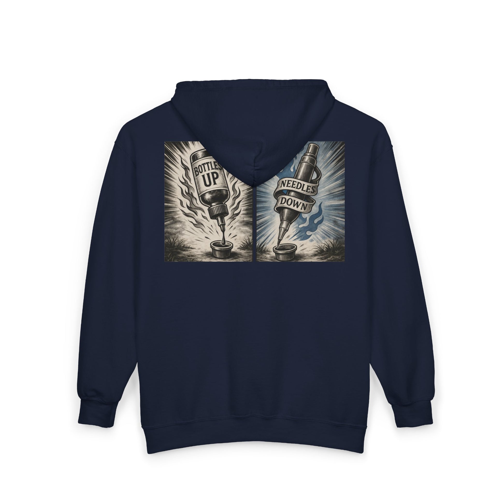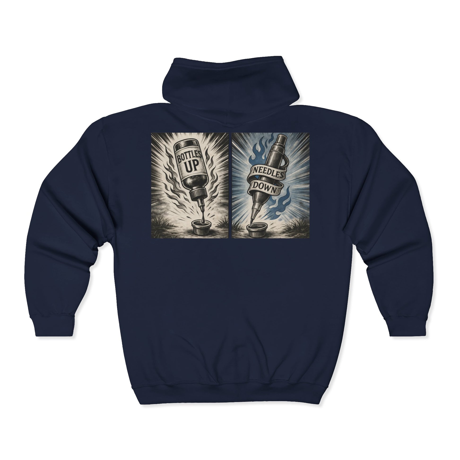 'Bottles Up, Needles Down' Full-Zip Hooded Sweatshirt - DeadCorative Graphic Zip-Up Jacket