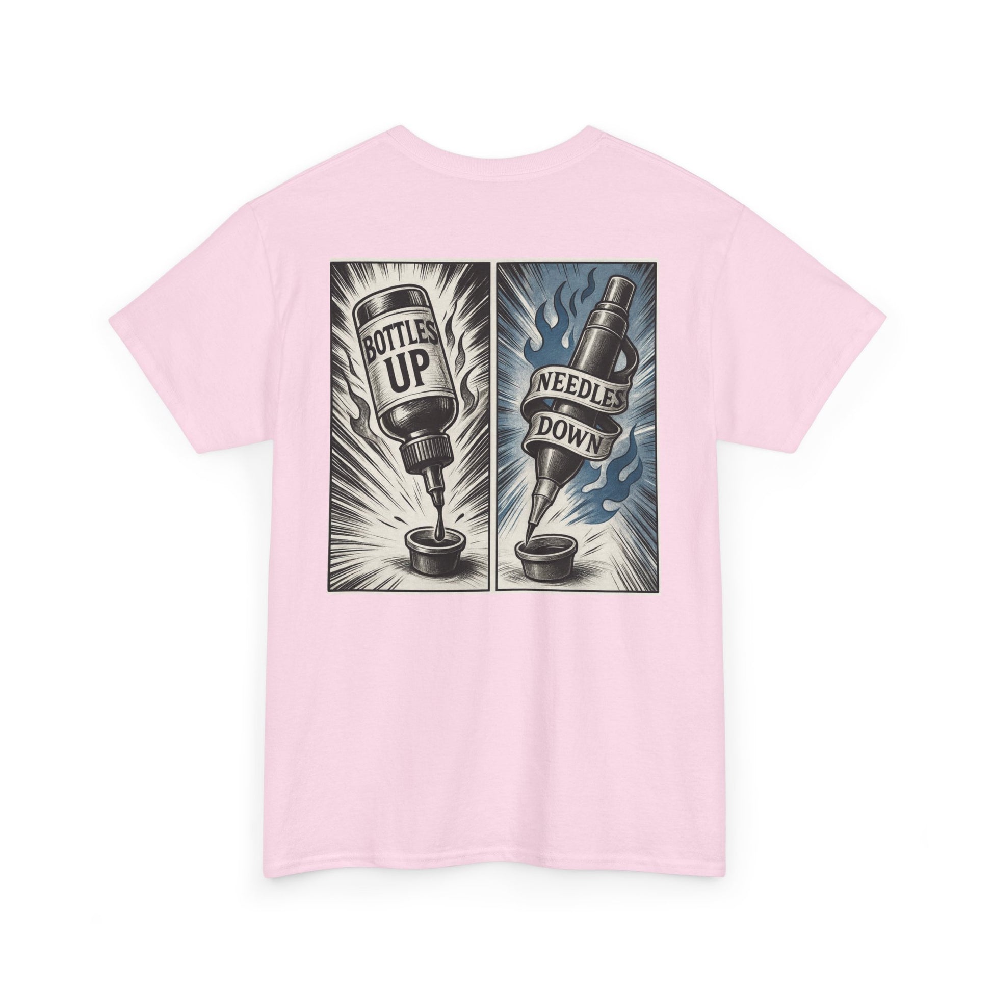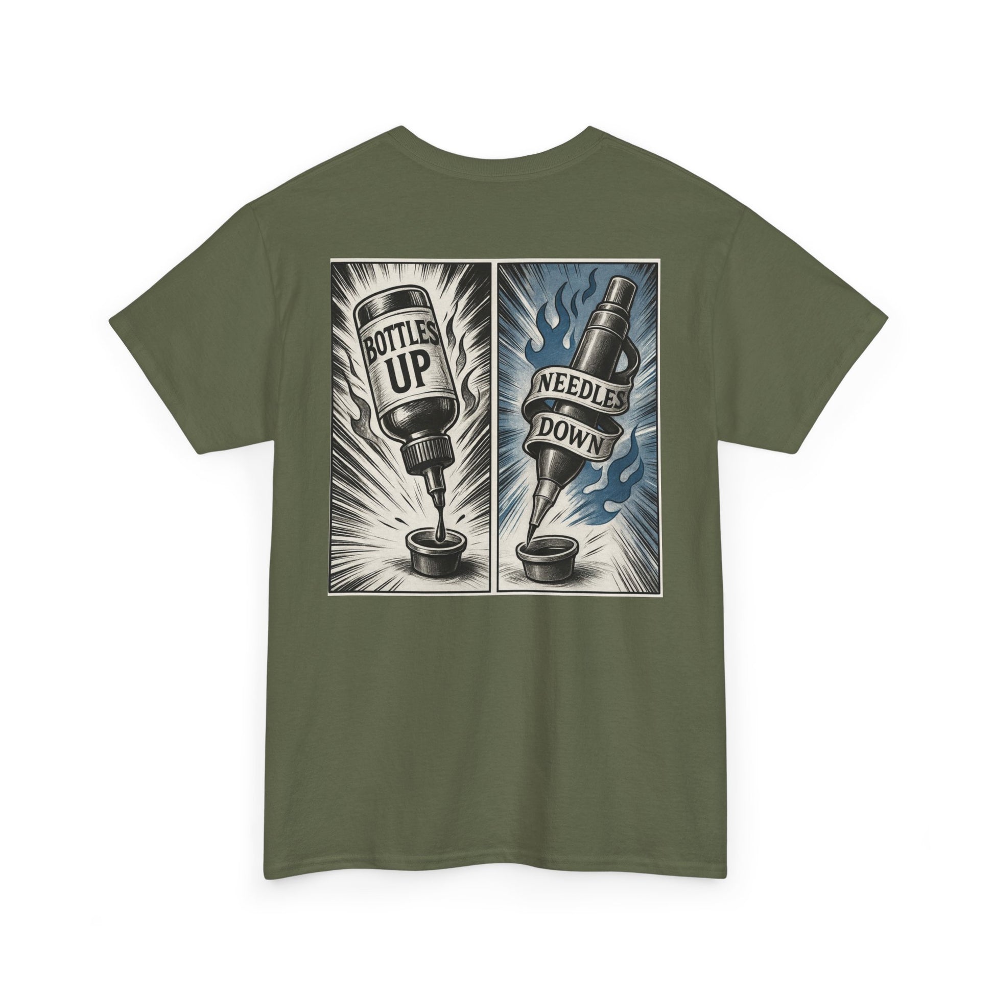 'Bottle Up / Needle Down' Tee — Deadcorative Graphic T-Shirt