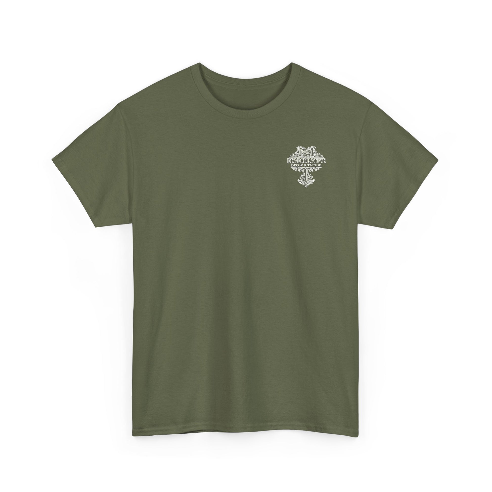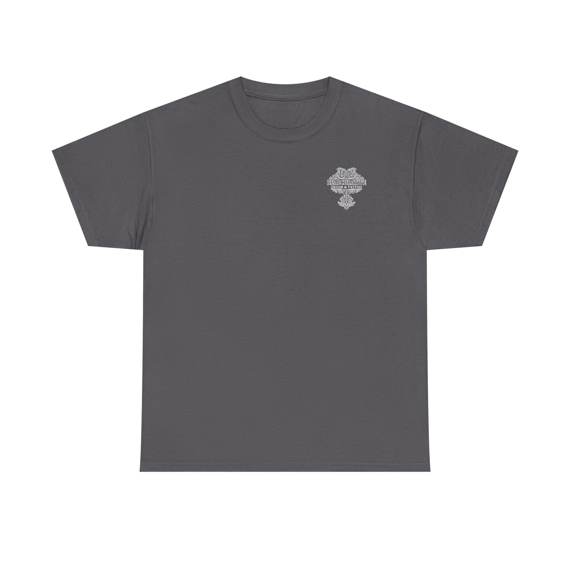 Material and construction details are solid: sturdy, smooth cotton that holds screen and digital prints with crisp detail, ribbed collar that keeps its shape, shoulder stay to prevent stretching, and a tear-away label for itch-free comfort. Ethically produced and certified for safety, this tee blends timeless tattoo imagery with reliable everyday wear.