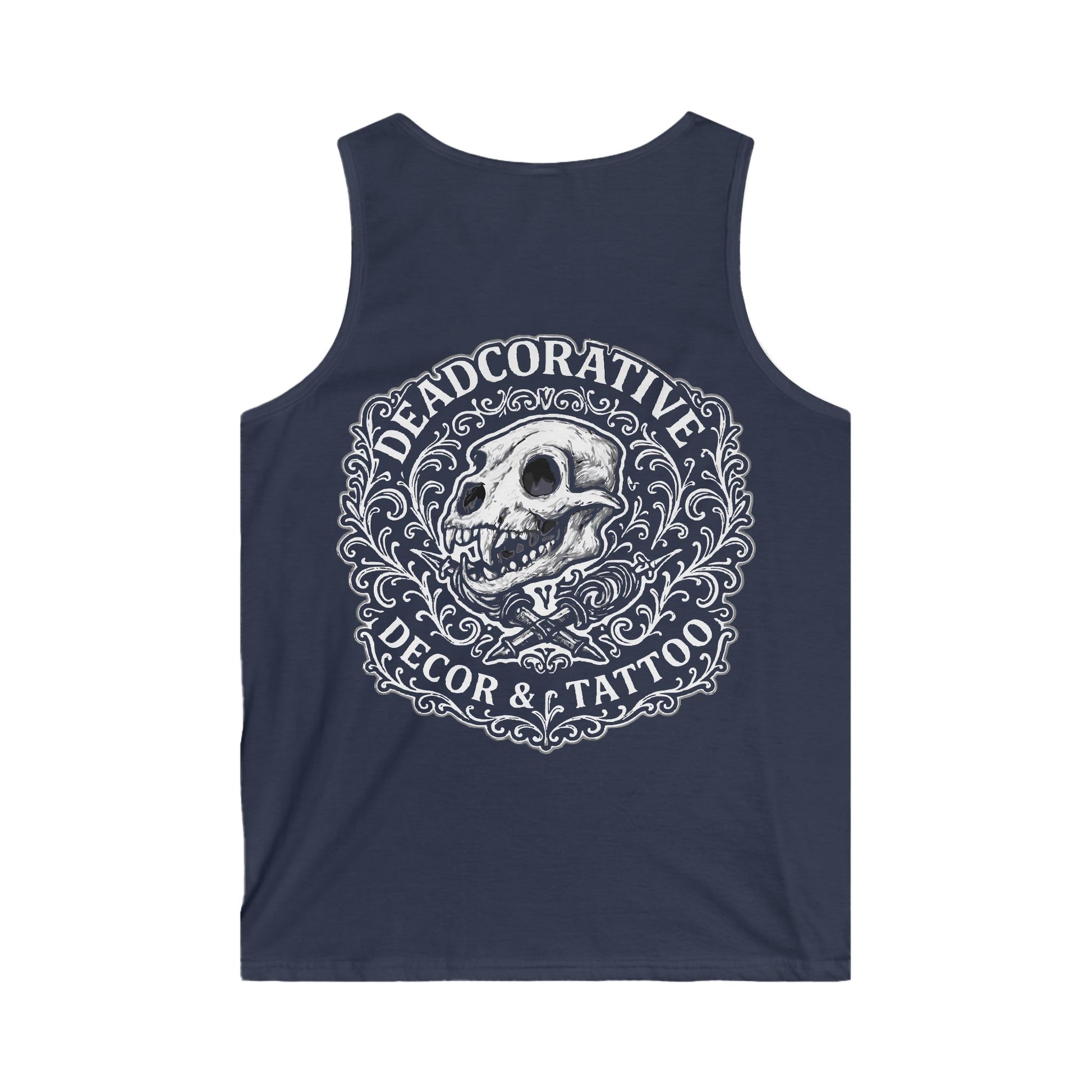 Tank Top — 'Deadcorative Decor & Tattoo' Gothic Skull Chest & Back Graphic