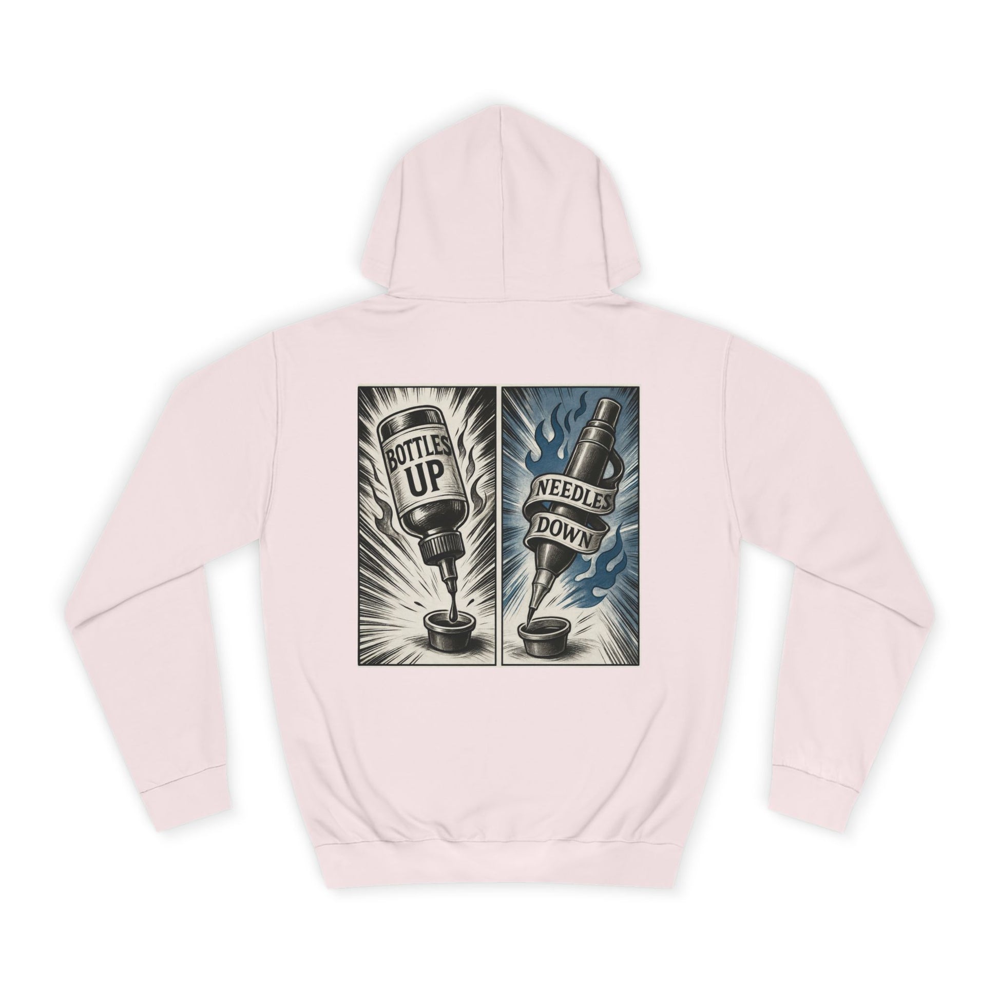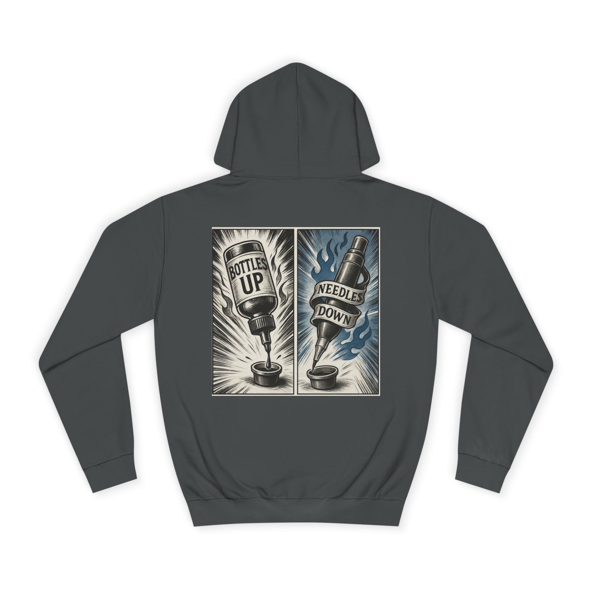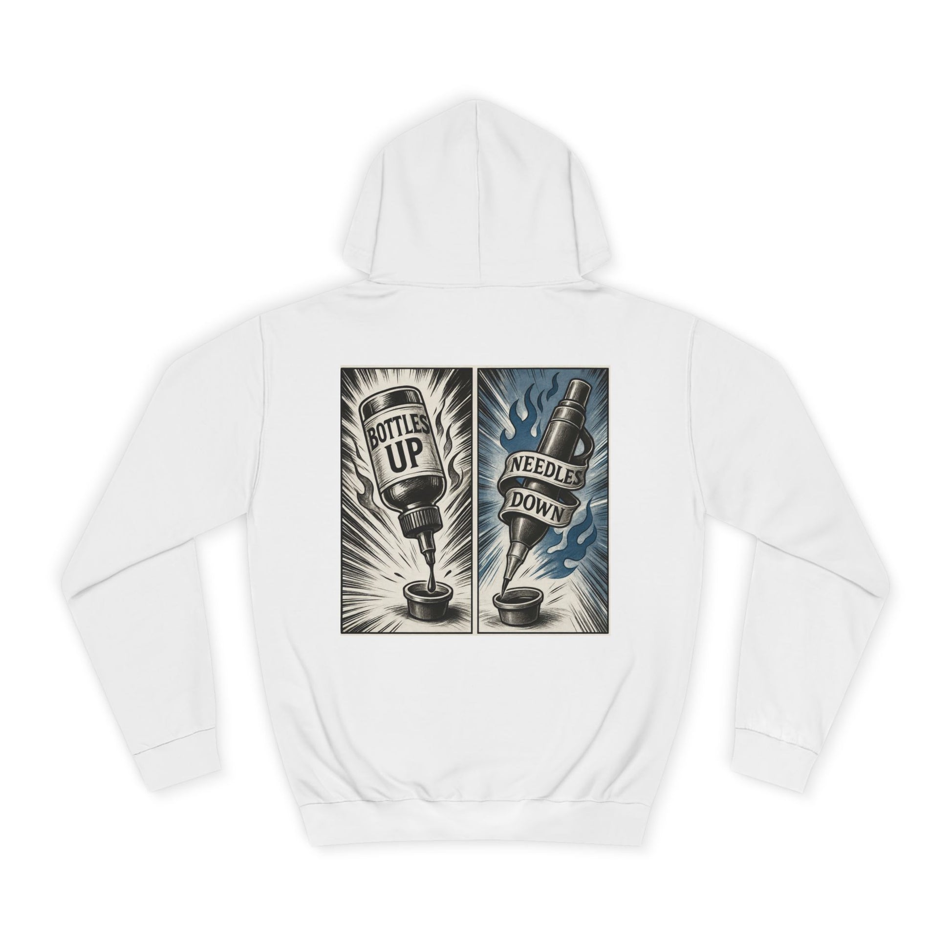 This hoodie carries the slow-brew attitude of a classic tattoo flash sheet — bold lines, limited color, and a little grit. The front keeps it subtle with a small emblem over the heart; the back tells the story: two panels that read “Bottle Up” and “Needle Down,” rendered like vintage poster art. It feels lived-in from the first wear: a roomy hood, a deep kangaroo pocket for cold hands, and a relaxed cut that layers easily over tees or flannels. Wear it on late nights at the shop, long drives between gigs, or while sketching by lamplight — it’s the kind of hoodie that settles into your daily rhythm and keeps you comfortable while you create.